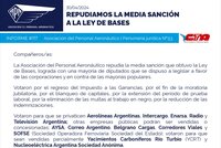 La Asociación del Personal Aeronáutico repudia la media sanción que obtuvo la Ley de Bases, lograda con una mayoría de diputados que se dispuso a legislar a favor de las corporaciones y en contra de las mayorías populares.