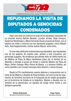 Desde la CTA manifestamos nuestra defensa y compromiso con la lucha de las Madres y Abuelas de Plaza de Mayo, así como la de los organismos de derechos humanos en la búsqueda de los bebés apropiados por el terrorismo de Estado en la Argentina. Madres y Abuelas son un símbolo de la democracia, un ejemplo de coraje cívico frente a una dictadura genocida.