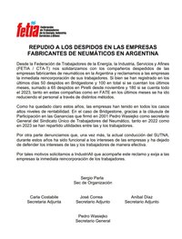 FeTIA - Repudio a los despidos en las empresas fabricantes de neumáticos en Argentina