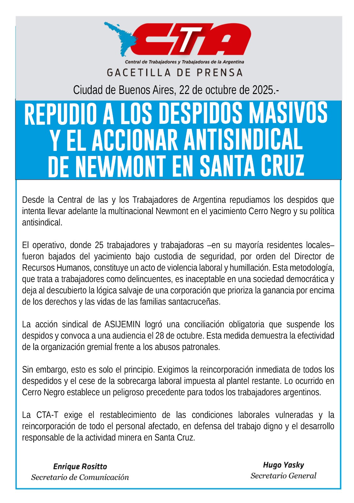 La CTA-T exige el restablecimiento de las condiciones laborales vulneradas y la reincorporación de todo el personal afectado, en defensa del trabajo digno y el desarrollo responsable de la actividad minera en Santa Cruz.