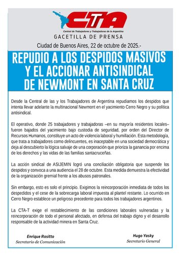 Desde la Central de las y los Trabajadores de Argentina repudiamos los despidos que intenta llevar adelante la multinacional Newmont en el yacimiento Cerro Negro y su política antisindical.