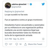 Y agregó: “Lo que sucedió no fue esto. Fue un operativo contra un grupo montonero. Estudiantes fueron secuestrados y asesinados por su militancia en una organización política mediante una acción represiva ilegal que buscaba desmantelar todos los frentes de lucha de la organización armada”.