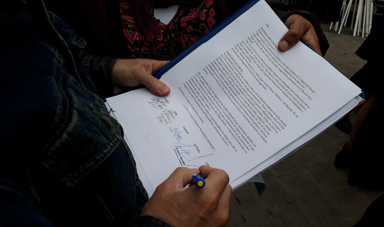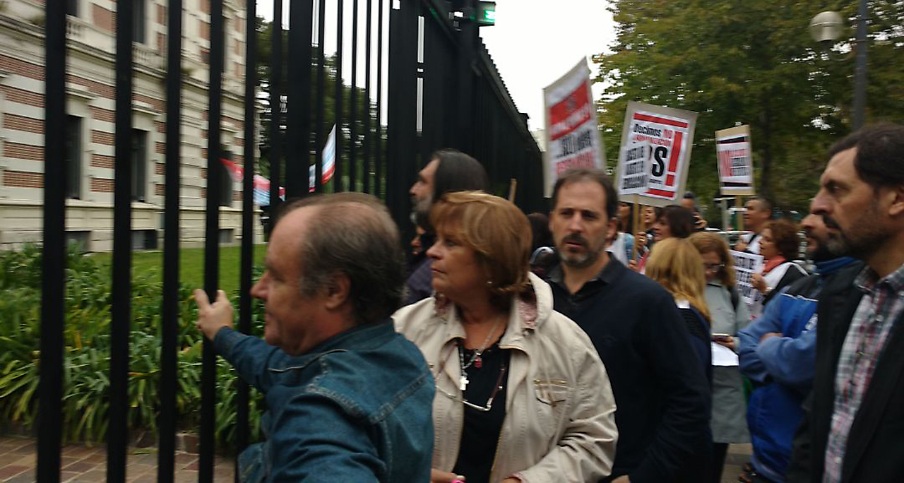 Representantes del Frente de Unidad Docente Bonaerense se encuentran bajo la lluvia en las puertas de la Casa de Gobierno de la provincia de Buenos Aires tratando de entregar un carta dirigida a la gobernadora María Eugenia Vidal.