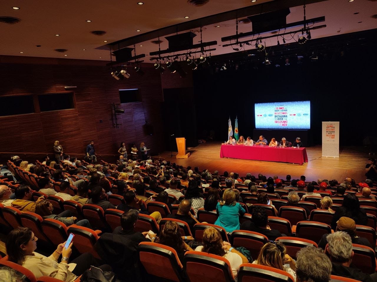 Hoy, en la Sala Astor Piazzolla del Teatro Argentino de La Plata, se llevó a cabo la actividad internacional ‘A 50 años del golpe de Estado: resistimos a la dictadura de ayer y al fascismo de hoy’, organizada por la CTA-T, la CTA-A y la CGT, con la participación de unos 300 asistentes y 73 delegados de organizaciones sindicales, representando a 18 países.